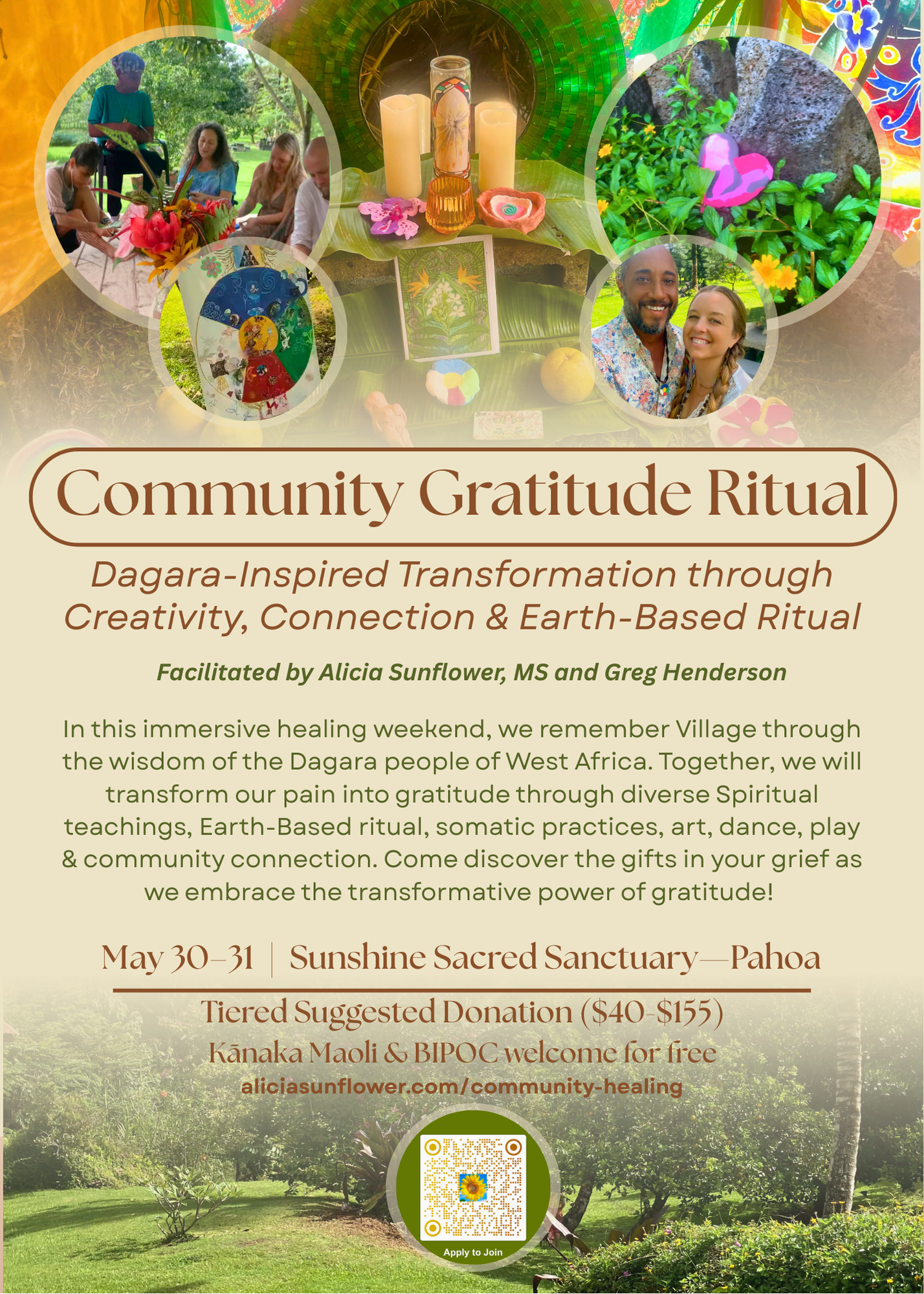 This indigenous earth-based gratitude ritual is a ritual of renewal! It is one that helps us heal grief and stuck energy through the transformational practice of gratitude. Based in elemental wisdom, and the magic of the village, this Gratitude Ritual was gifted to the West by the Dagara people of West Africa via Sobonfu Somé, an African Spirituality teacher from Burkina Faso. Alicia Sunflower and Greg Henderson (co-facilitators of this ritual) have been initiated into this lineage by our teacher Maria Christina Owl.